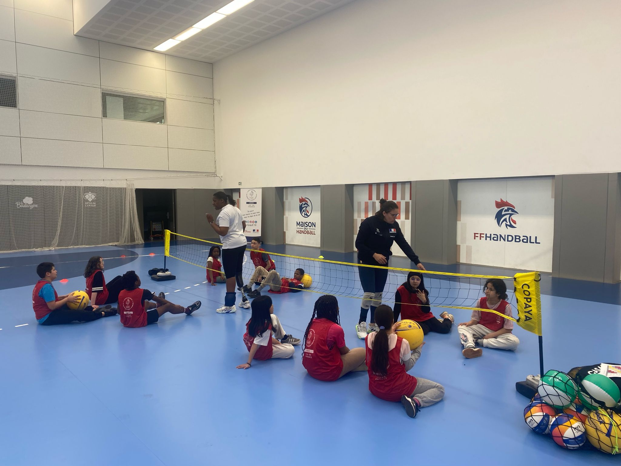 Ce ne sont pas moins de 6 groupes d’enfants issus des centres de loisirs qui se sont succédé sur le terrain. Chaque groupe a bénéficié de 40 minutes d’immersion totale dans le monde du Volley Assis. Ils ont pu apprendre à maîtriser les déplacements au sol et la coordination, ils ont également pu faire des premiers échanges et matchs pour découvrir les sensations de la discipline. Enfin, les jeunes ont bénéficié d’un moment privilégié en fin de séance pour poser des questions à Jenna et Estelle sur leur parcours d’athlètes de haut niveau.